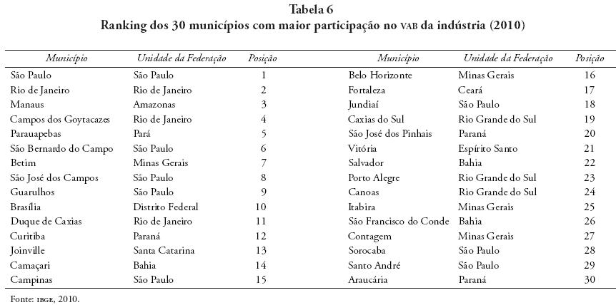 A tabela 6 ilustra este fenômeno dos polos industriais cuja influência frequentemente ultrapassa perímetros municipais e acaba atraindo indústrias para cidades vizinhas: