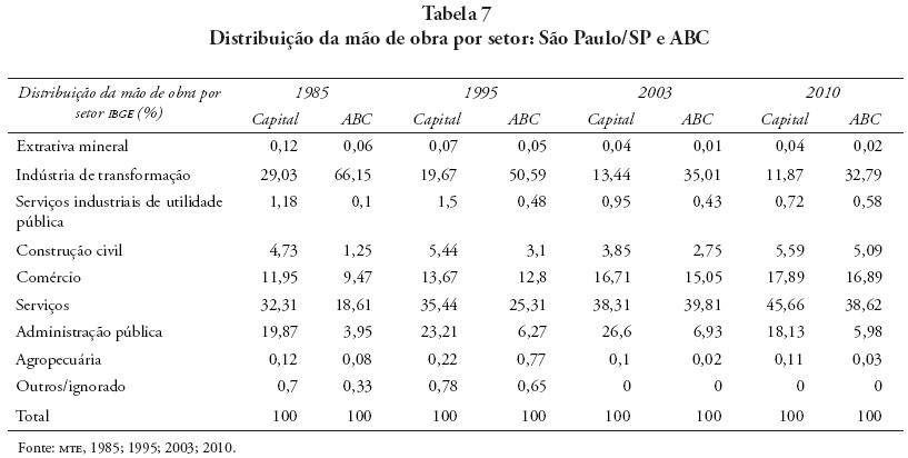 Os dados da tabela 7 mostram a mudança na composição da distribuição da mão de obra no mercado de trabalho formal do ABC paulista e da cidade de São Paulo durante o período 1985-2010. Impressiona o quanto as duas regiões tiveram queda de participação do setor industrial relativamente ao total da mão de obra formal. Mas é notável que o mercado de trabalho formal do ABC é muito mais especializado na indústria de transformação do que o mercado da capital paulista, com participação relativa 2,76 vezes maior (32,79/11,87) em 2010.