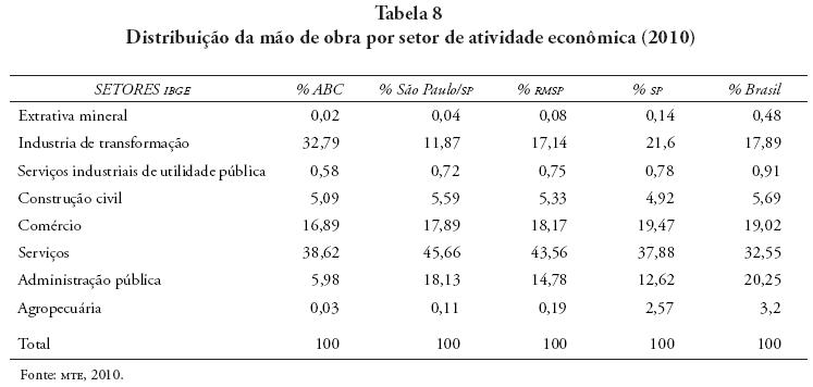 A tabela 8 ilustra melhor as diferenças na composição do mercado de trabalho do ABC relativamente à cidade de São Paulo. Ali estão dados da participação relativa da indústria de transformação no mercado de trabalho do ABC, cidade de São Paulo, RMSP, estado de São Paulo e do Brasil.