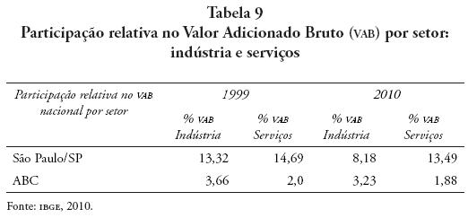 A capital paulista e a região do ABC paulista regiões adjacentes e termos geográficos são os dois extremos da tabela. Enquanto a capital paulista tem a menor participação relativa da indústria de transformação (destacando-se por outro lado nos serviços), o ABC paulista é incontestavelmente um destaque quanto à participação relativa da mão de obra na indústria de transformação. Ou seja, a despeito da forte perda de empregos (absoluta e relativa) registrada ao longo de 1990, o ABC continua sendo uma microrregião com forte acento industrial. A tabela 9 reforça a conclusão do parágrafo anterior: 1) Ilustra a diminuição da importância do PIB industrial da capital paulista relativamente ao total da indústria nacional. Em 2010, a participação da indústria paulistana (8,18%) relativamente ao total nacional era equivalente a 61,41% da participação em 1999 (13,32); 2) Mostra que a indústria do ABC paulista em 2010 tinha 88,25% da participação que teve no ano de 1999 variação de 3,66 para 3,23%.