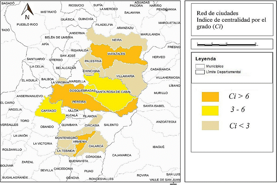 En cuanto a las medidas de orden local, la referida a la centralidad por grado de cada ciudad se define como el número de puntos a los cuales ella es adyacente (NCn en la Tabla 1). Como se evidencia, las tres ciudades capitales presentan el mayor número de conexiones directas en la red, Manizales y Armenia son las ciudades con mayores vínculos (nueve), que les permiten un acceso rápido desde y hacia los municipios de su conglomerado, las dos capitales restantes y tres municipios del conglomerado de Pereira. En lo que corresponde a esta última, además de las conexiones con su conglomerado y las capitales, observa una conexión directa adicional con uno de los municipios del conglomerado de Armenia (Figura 2).
