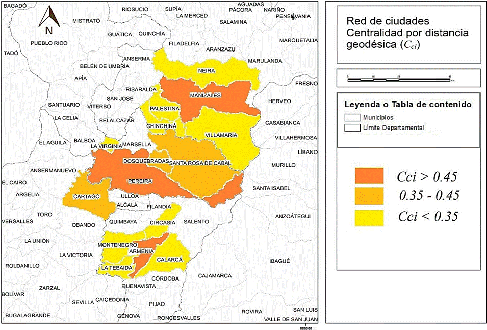 En los resultados contenidos en la Tabla 1 y la Figura 4, Manizales, Armenia y Pereira, en su orden, destacan como las ciudades con mayor centralidad por distancia geodésica o centralidad de cercanía, por lo que de manera correspondiente son las que requieren menor cantidad de pasos para llegar desde ellas a las demás ciudades que integran la red. Por otra parte, Dosquebradas, Santa Rosa de Cabal y Cartago, observan condiciones intermedias de centralidad de cercanía, con un índice de profundidad (TDn) inferior al promedio de la red; en tanto, el resto de municipios presenta limitadas condiciones de centralidad de este tipo, especialmente La Virginia, que observa una especial lejanía geodésica con las ciudades no capitales de los conglomerados de Manizales y Armenia; Montenegro, La Tebaida y Calarcá, que presentan una distancia geodésica mayor con los municipios del conglomerado de Manizales y todos los municipios del conglomerado de Manizales (Tabla 2).