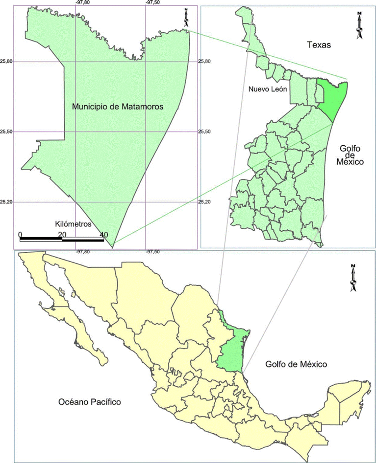 Dicha localidad pertenece a uno de los 43 municipios del estado de Tamaulipas, el cual se ubica al norte, en la región fronteriza a una altitud promedio de 10 msnm (Mapa 1), con una extensión territorial de 4046 km² y una población al censo de Inegi (2011a) de 489,193 habitantes.
