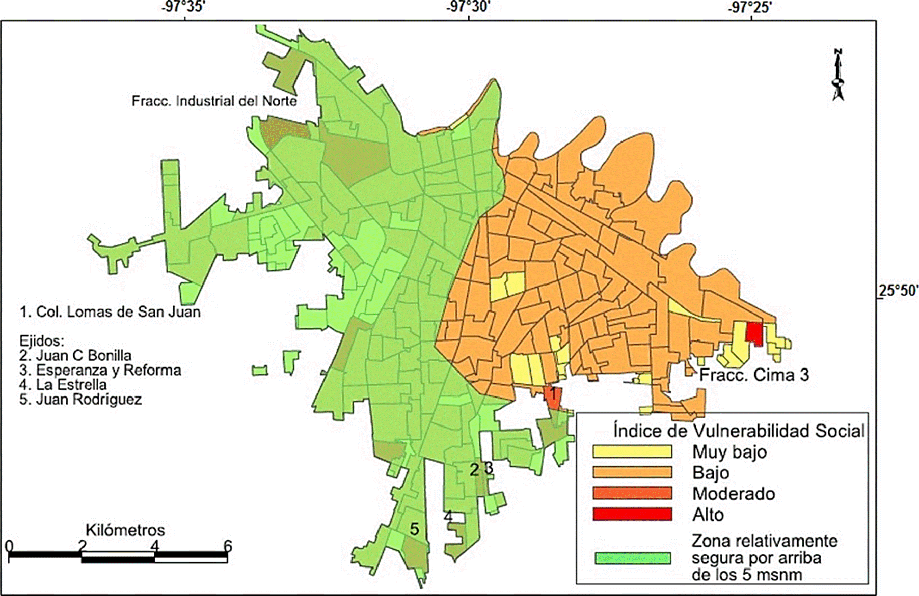 Por otra parte, en términos de vulnerabilidad, es preciso señalar que la margen sur de la desembocadura del río Bravo prácticamente es la más riesgosa, en particular las áreas ru-rurbanas (antiguos ejidos) ubicadas en la porción oriental de la demarcación municipal (zona baja menor a cinco msnm), dicha zona de inundación, también puede estudiarse desde lo que Tovar Cabañas y Vázquez Espinosa (2017) denominan potamoweack (una parasíntesis que emplean dichos autores para darle mayor fluidez epistemológica a la vulnerabilidad vinculada exclusivamente a una inundación). En ese sentido, usando los datos sociodemográficos del Inegi (2011a), a través de un cociente de localización (Lira y Quiroga, 2009) adaptado para fabricar un índice de vulnerabilidad social se pudo conocer de forma relativa el nivel socioeconómico de las principales manzanas urbanas en situación de potamoweack de la ciudad costera de Matamoros.