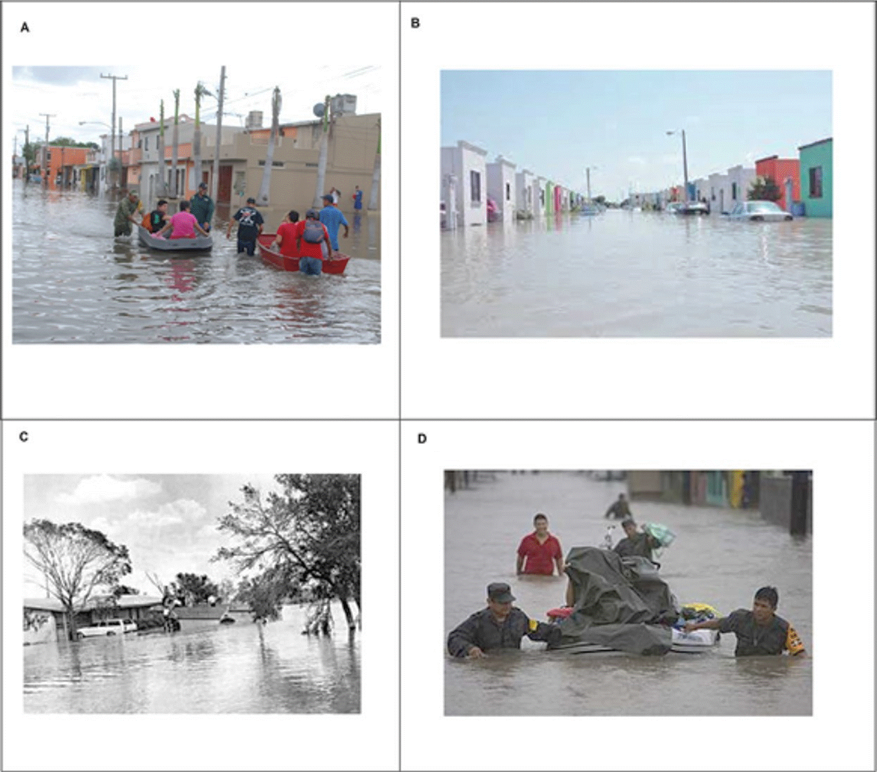 Nota: Las fotografías corresponden a los siguientes casos de inundaciones: a) inundación de 2015; b) fraccionamiento vulnerable a menos de cinco msnm; c) inundación de 1967; d) plan DNIII tras el paso del huracán Dolly de 2008, Matamoros, Tamaulipas, México.