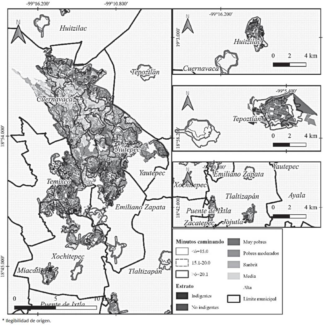 A escala municipal, el peor acceso peatonal se encuentra en la población de los estratos más bajos (indigentes y no indigentes) y, además, donde existen condiciones de homogeneidad en la pobreza, como sucede en Huitzilac y Emiliano Zapata. En el primer caso, 71.56% de los indigentes vive a más de 20 minutos de los centros de atención de primer nivel de la SSA; en el segundo, la cifra corresponde a 27.64% de la población de indigentes.