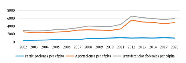 En la gráfica 5 se desglosan las transferencias per cápita en sus dos componentes. Se puede ver que las aportaciones (línea naranja) son las que mayor peso tienen en el crecimiento de las transferencias; en cambio, las participaciones (línea azul) no han rebasado los $1000 per cápita.