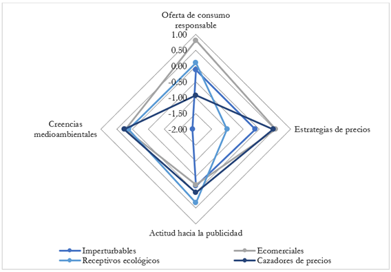 En este apartado se describen los perfiles de los consumidores con las características más particulares de los cuatro grupos, determinados por las puntuaciones de los centroides del grupo en los factores de oferta de consumo responsable, estrategia de precios, actitud hacia la publicidad y creencias proambientales. Además, se añaden descripciones sobre el perfil sociodemográfico y hábitos de consumo.