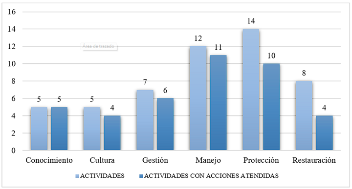 La atención en el cumplimiento de las actividades previstas en el PM, por cada subprograma mediante acciones concretas de las cuales se tuvo evidencia fue en promedio de 79%. Destacan los subprogramas conocimiento (100%), cultura (80%), gestión (86%) y protección (71%). El subprograma con el menor cumplimiento fue el de restauración, con 50% (gráfica 1).