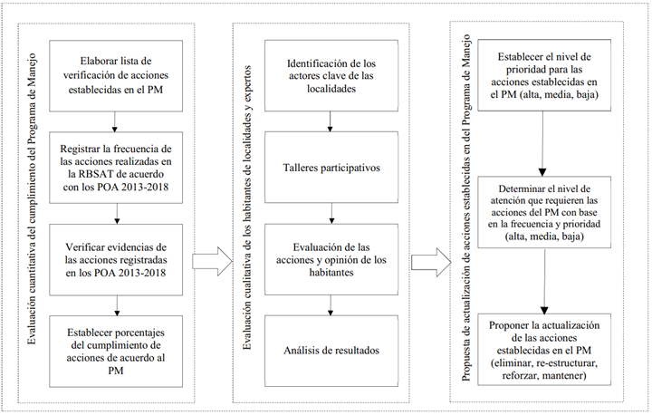 Los Programas de Manejo (PM) de las ANP son los instrumentos rectores de planificación y regulación, y establecen las actividades, acciones y lineamientos básicos para su manejo y administración. El Reglamento de la Ley General del Equilibrio Ecológico y la Protección al Ambiente (LGEEPA), en materia de ANP, señala que cada PM debe ser revisado al menos cada cinco años, con el propósito de evaluar su efectividad y determinar si requiere ser actualizado o mantiene su vigencia (Reglamento de la Ley General del Equilibrio Ecológico y la Protección al Ambiente en Materia de Áreas Naturales Protegidas, 2014). Ante esta realidad, es necesario evaluar de manera integrada y objetiva, con indicadores cuantitativos y cualitativos, el nivel de cumplimiento de los PM y definir con mayor precisión los mecanismos para su actualización. El objetivo de este trabajo fue diseñar y aplicar un esquema alternativo de evaluación basado en la participación social para valorar el cumplimiento del PM de la RBSAT.