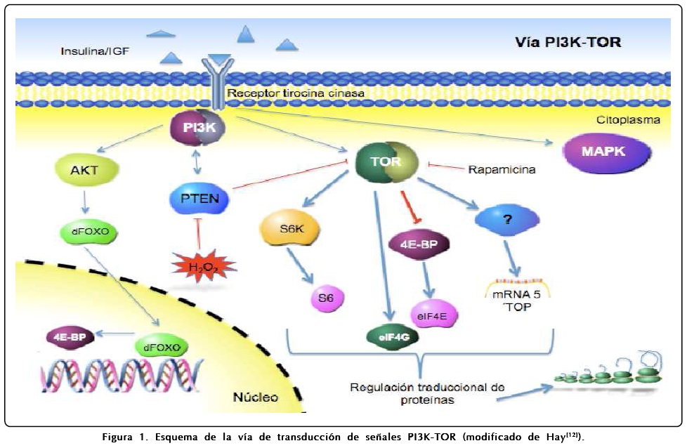 Esta señal puede ser revertida por antioxidantes[9-13]. En plantas, la enzima PTEN ha sido muy poco estudiada, así como también la vía de transducción de señales PI3K-TOR en la que participa. En el maíz se ha reportado un factor proteico (ZmIGF) de la familia de los "Insulin-like" growth factors (IGFs), el cual favorece la germinación y el crecimiento de ejes embrionarios del maíz, incrementando significativamente la síntesis de proteínas ribosomales[14] y la del ADN[15]. Este proceso depende también de la vía de transducción de señales PI3K-TOR, la cual antagoniza con la acción de PTEN a nivel de los pozos de los fosfolípidos PIP3/PIP2 (ver diagrama en la Fig. 1) en forma similar, a la vía equivalente de mamíferos[16,17].