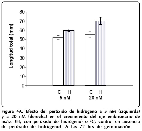 Lotes de 50 semillas desinfectadas se colocaron en charolas de plástico en medio de dos capas de algodón y se embebieron: el lote control únicamente en agua y los demás lotes en peróxido de hidrógeno a diferentes concentraciones. Esto se realizó en presencia y ausencia de EMT 1 mg/ml. El tiempo de incubación fue de 72 hrs a 24 °C ± 2 °C en oscuridad constante. Al final del experimento se determinó la longitud de la raíz y del coleóptilo de las plántulas obtenidas en cada lote.