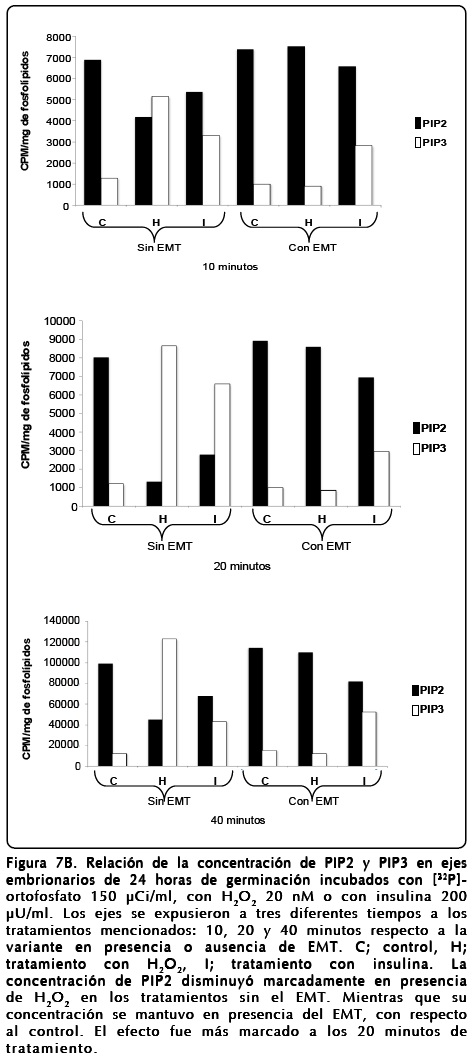 Para comprobar que los efectos observados por el H2O2 se deben realmente a la inhibición de la actividad de la fosfatasa PTEN, se midió directamente el efecto del H2O2 en la actividad de la enzima PTEN. Dado que la función de PTEN corresponde a la defosforilación de PIP3 para convertirlo en PIP2, se midió la incorporación de [32P]-ortofosfato tanto en el sustrato como en el producto de PTEN en condiciones de estimulación con H2O2 o insulina. Los resultados de estos experimentos, después de llevar a cabo la separación de los compuestos producidos por cromatografía en capa fina (Fig. 7A) y la medida de la radiactividad incorporada en ellos (Fig. 7B), muestran la inhibición de la actividad de PTEN y como consecuencia la acumulación de PIP3 al tratar los ejes con peróxido de hidrógeno. En el caso de la insulina, su estímulo provoca un incremento en la PI3-Kinasa generando también una acumulación de PIP3. Por otra parte el tratamiento de los ejes con el antioxidante EMT anuló el efecto del H2O2 regresando los valores de PIP3 a los de nivel del control (Fig. 7B).
