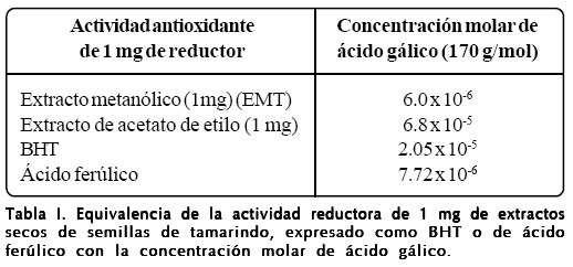 Con el método de Singleton y Rosi[21] se midió la actividad de extractos de semilla de tamarindo con diferentes disolventes y se obtuvieron los resultados que se muestran en la Tabla I, comparando la reducción del reactivo con 1 mg de residuos sólidos de extractos de tamarindo con 1 mg de BHT y de ácido ferúlico. Se calculó la actividad reductora de 1 mg de los extractos metanólico (EMT) y de acetato de etilo secos. Se observó que el extracto metanólico tiene una actividad similar a la del ácido ferúlico, pero del orden 10 veces mayor que la del antioxidante comercial.