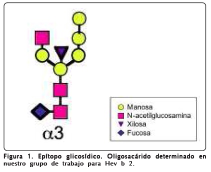El látex del árbol de hule (NRL), Hevea brasiliensis, contiene varias proteínas involucradas en hipersensibilidad de tipo I. En general, estas proteínas están implicadas en mecanismos de defensa de la planta y también en reacciones de reactividad cruzada con frutas, polen y venenos de insectos. Existe muy poca información estructural acerca de estas proteínas y, por lo tanto, de los determinantes antigénicos que dan lugar a los síntomas de la alergia. Entre los alérgenos presentes en el hule natural existen ß-1,3-glucanasas (Hev b 2), lectinas (Hev b 6.02), quitinasas de clase I (Hev b 11) y profilinas (Hev b 8). Recientemente nuestro grupo de trabajo determinó la estructura tridimensional de dos cristales polimórficos de una isoforma glicosilada natural de Hev b 2[5] a 2.5 Â y 2.8 Â de resolución, respectivamente. La estructura muestra tres sitios de modificación postraduccional, dos de glicosilación y la ciclización del ácido glutámico para formar un anillo de lactama conocido como ácido piroglutámico. La isoforma I presenta un contenido de carbohidratos cercano al 20%, con azúcares unidos a residuos de asparagina del tipo N-acetil-glucosamina, N-acetilgalactosamina, fucosa y galactosa, mientras que la isoforma II presenta un contenido de carbohidratos del 6% consistiendo de N-acetil-glucosamina, fucosa, manosa y xilosa cuya estructura correspondió al decasacárido GlcNAcMan5XylFucGlcNAc2[5] (Figura 1). Es interesante mencionar que a la fecha no existen reportes sobre la cristalización de ß-1,3-glucanasas nativas glicosiladas. Las autoras de esta nota hemos demostrado que los patrones de glicosilación son importantes en el reconocimiento por las IgEs de sueros de pacientes.