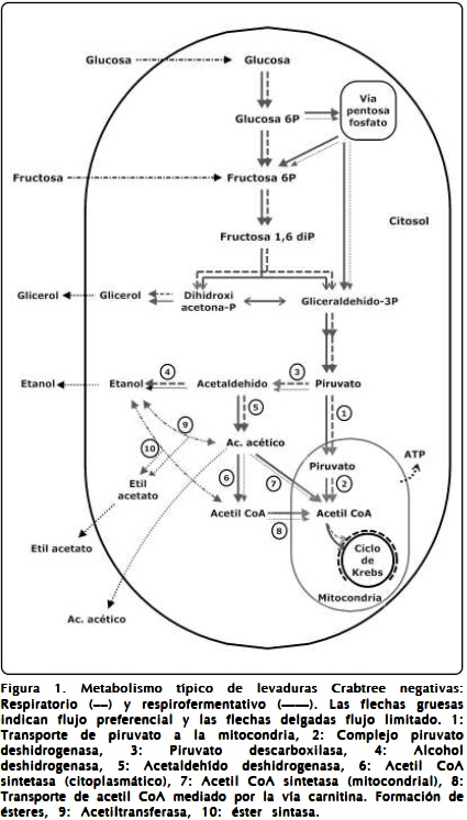 A condiciones de limitación de oxígeno se estimularía el metabolismo respirofermentativo17, así entonces el piruvato es convertido en acetaldehído por la piruvato descarboxilasa y luego puede ser reducido bien a etanol por la alcohol deshidrogenasa18,36, u oxidado a ácido acético por la acetaldehído deshidrogenasa NADP-dependiente37. El acetaldehído funciona como receptor terminal de electrones cuya reducción por el NADH genera etanol18,38. En levaduras "Crabtree negativas" en presencia de oxígeno, el acetaldehído es preferentemente oxidado a acetato por la acetaldehído deshidrogenasa y luego convertido en acetil CoA por la acetil-CoA sintetasa39,40. Sin embargo, la acumulación de ácido acético bajo condiciones de limitación de oxígeno resultaría de la insuficiente actividad de la acetil-CoA sintetasa requerida para la oxidación completa del acetato39. Por otro lado, la producción de glicerol estaría también ligada a la necesidad de reoxidar el NADH generado durante la glucólisis41.