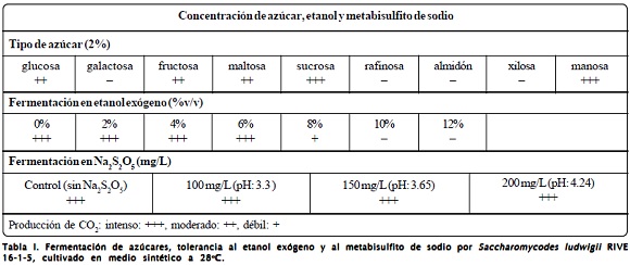 Las levaduras difieren en su capacidad de fermentar azúcares, esta característica es fundamental para definir su utilidad en procesos fermentativos. Como se muestra en la Tabla I, Saccharomycodes ludwigii RIVE 16-1-5 es capaz de fermentar glucosa, fructosa y manosa. Estos azúcares generalmente están presentes en los jugos de fruta. La fermentación de sucrosa y maltosa es una característica importante, ya que indica que esta cepa puede ser utilizada para fermentar mostos que contengan estos azúcares, como por ejemplo, aquéllos preparados a base de cereales.