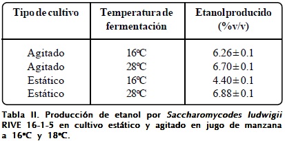 Las levaduras oxidativas cultivadas bajo limitación de oxígeno tienden a producir etanol debido a la interrupción de su actividad respiratoria. La respiración y la fermentación suceden al mismo tiempo, la concentración de oxígeno en el medio de fermentación determina el balance entre el metabolismo respiratorio y respirofermentativo. Sin embargo, en un metabolismo mixto la generación de energía disminuye, y como resultado también la tasa de crecimiento, para dar paso a la formación de compuestos típicos de la fermentación alcohólica. En la Tabla II se muestran las concentraciones de etanol producido por Saccharomycodes ludwigii RIVE 16-1-5. Se ha observado una mayor producción de etanol en cultivo estático (6.88%v/v) a 28ºC. La agitación del medio parece influir en la disminución de la producción de etanol al menos en cultivos realizados a 28ºC. Así mismo, la diminución de la temperatura no afectó sustancialmente la producción de etanol en cultivo agitado, por el contrario esto no sucedió en cultivo estático donde la producción de etanol disminuyó de 6.88 a 4.44%. Si bien esta cepa produjo como máximo 6.88%v/v de etanol, que es una cantidad suficiente para producir bebidas con contenido medio de etanol (por ejemplo sidras), aún así no produjo mayores cantidades, como fue reportado por Ciani y Maccarelli49 y Granchi et al.48. Además, este resultado confirma que una cepa de levadura tolera la cantidad de etanol que es capaz de producir (ver Tabla I). La disminución de producción de etanol en cultivo agitado (al menos a 28ºC) se debería al efecto del oxígeno incorporado al medio durante la agitación. Esto explica que Saccharomycodes ludwigii RIVE 16-1-5 prefiere oxidar la glucosa en presencia de oxígeno antes que fermentarla.