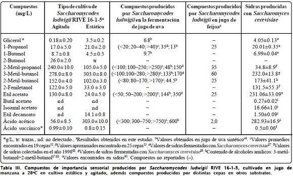 Lo contrario se ha observado en cultivo estático donde la concentración de ácido acético es relativamente alta (303.0±10.0 mg/L), mientras que la concentración de etil acetato llegó hasta 24.0±5.0 mg/L. En general, se considera que el oxígeno afecta de manera inversa la síntesis de ésteres, desde que promueve la formación de acetil CoA (co-substrato), la cual es utilizada en la síntesis de componentes celulares91-93. Esto es razonable en el caso de levaduras "Crabtree negativas" desde que no presentan represión del crecimiento por la glucosa. Sin embargo, la mayor formación de etil acetado en cultivo agitado con Saccharomycodes ludwigii RIVE 16-1-5 involucraría otros factores propios de la cepa. Por otra parte, se ha observado una deficiencia en la producción de ésteres diferentes a etil acetato en ambos tipos de cultivo, lo que representaría una desventaja para su aplicación en la producción de bebidas fermentadas. Cepas con baja producción de etil acetato (<50 mg/L) fueron también reportadas por Romano et al.31.