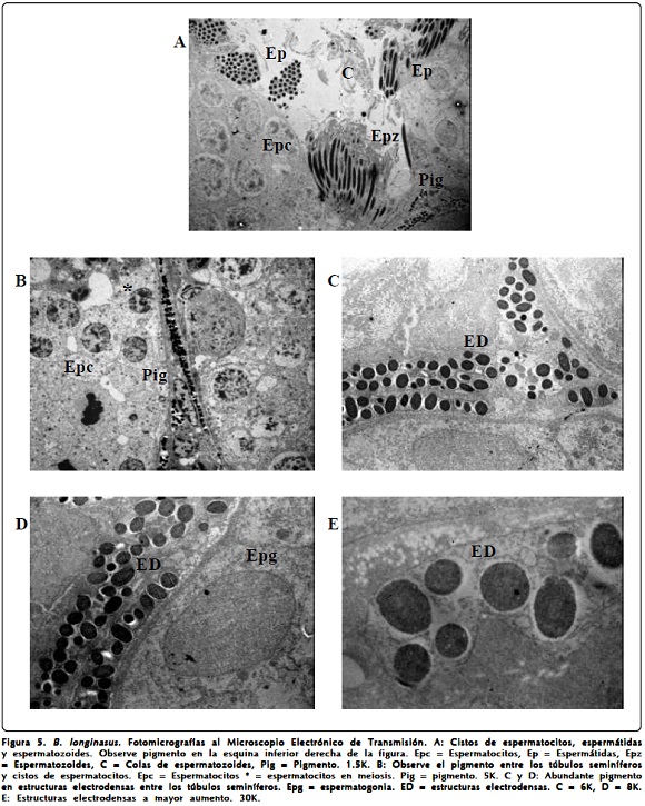 Todas las preparaciones observadas correspondieron con animales en plena etapa reproductora que estaban en espermatogénesis total. Se apreciaron en ellas espermatogonias, espermatocitos primarios en meiosis (Figura 5B), espermatocitos secundarios, espermátidas en diferentes estadios (redondas y en diversos grados de alargamiento) y espermatozoides. Todas las células se observaron sustentadas por las células de Sertoli (Figura 1D). Entre los túbulos seminíferos hay tejido intersticial compuesto por células de Leydig, fibroblastos, pigmentos y vasos sanguíneos.