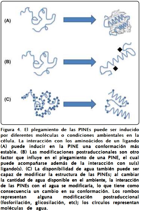 La multifuncionalidad que se ha observado en algunas de las PINEs es el resultado de modificaciones postraduccionales que favorecen ciertos cambios conformacionales, lo que les permite presentar una interfase diferente y con ello modular el reconocimiento a sus moléculas blanco (Fig. 4). Éste es el caso de modificaciones por fosforilación en diferentes PINEs, como sucede con CFTR (regulador de la conductancia transmembranal en la fibrosis cística), el cual ante una señal es fosforilado, lo que induce un cambio en su conformación y en el modo de unión de esta proteína a sus blancos15. Otro ejemplo bien caracterizado ocurre en CBP (CREB Binding Protein), cuyo dominio KIX interacciona con el dominio KID de CREB. Esta interacción requiere de la fosforilación del dominio KID, la cual habilita la alta afinidad por el dominio KIX. En este caso, tanto la forma fosforilada como la no fosforilada del dominio KID se encuentran no estructuradas en solución; sin embargo, la KID fosforilada se pliega al unirse al dominio KIX, de esta manera la flexibilidad intrínseca del dominio KID de CBP, ante la modificación por fosforilación, facilita la interacción con el dominio KIX de CREB6.