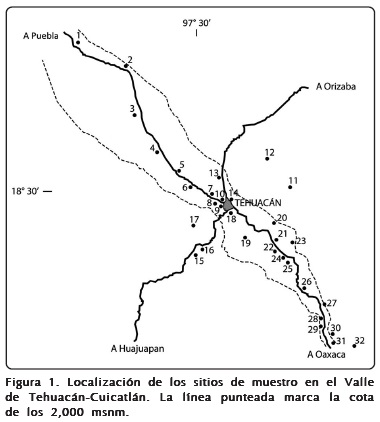 El Valle de Tehuacán-Cuicatlán está situado entre los 17° 39' y los 18° 53' N y los 96° 55' y los 97° 44' O. Limita al este con la Sierra de Zongolica, al oeste con la Sierra de Zapotitlán, la Sierra de Zoltepec al norte y al sur con la Sierra de Tepeaca. El Valle se extiende en dirección NO-SE con un área de más de 10,000 km2. Al norte está comunicado con La Mesa de Puebla y tiene una altitud media de 1200 msnm. Los principales ríos de esta zona son el Tehuacán, el Tonto, el Zapotitlán, el Chilac y el Salado y son parte de la cuenca alta del Río Papaloapan que también incluye las Lagunas Mayor y Menor de San Bernardino Lagunas. Todo el Valle está comunicado por canales de irrigación. El clima predominante es semiárido con lluvias en verano, la temperatura media anual es de 18 °C; el índice de aridez (Emberger modificado) es de 53 a118 (semiárido), pero existen dos áreas con un índice mayor, indicando zonas áridas como parte del Valle16. La vegetación original es selva baja caducifolia en las laderas de la Sierra de Zongolica y selva baja espinosa caducifolia y matorral crasicaule en la Sierra de Zapotitlán. En el centro del Valle predomina el matorral crasicaule y el matorral desértico rosetifolio. Caracterizaciones detalladas del Valle se encuentran en múltiples publicaciones entre las que destacan las de Dávila et al.11 y Valiente-Banuet et al.1,18