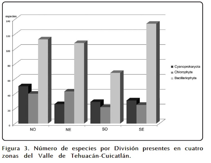 Otra de las características notables en la distribución de las especies está relacionada con la presencia diferencial de Cyanoprokaryota en el NO, de Chlorophyta en el NE y de Bacillariophyta en el SE. En general, es difícil asociar condiciones ambientales a los niveles taxonómicos altos, pero revisando las especies en particular que aparecen en la Tabla III podemos sugerir que en la Zona NO se desarrollan más las especies resistentes a la desecación y formadoras de películas perifíticas o subaéreas, en el NE se desarrollan Chlorophyta asociadas a condiciones de eutrofización de las aguas y en el SE las Bacillariophyta que son principalmente resistentes a los cambios de salinidad y de aguas alcalinas, en general, esa caracterización corresponde con los tipos de cuerpos de agua en el período estudiado.