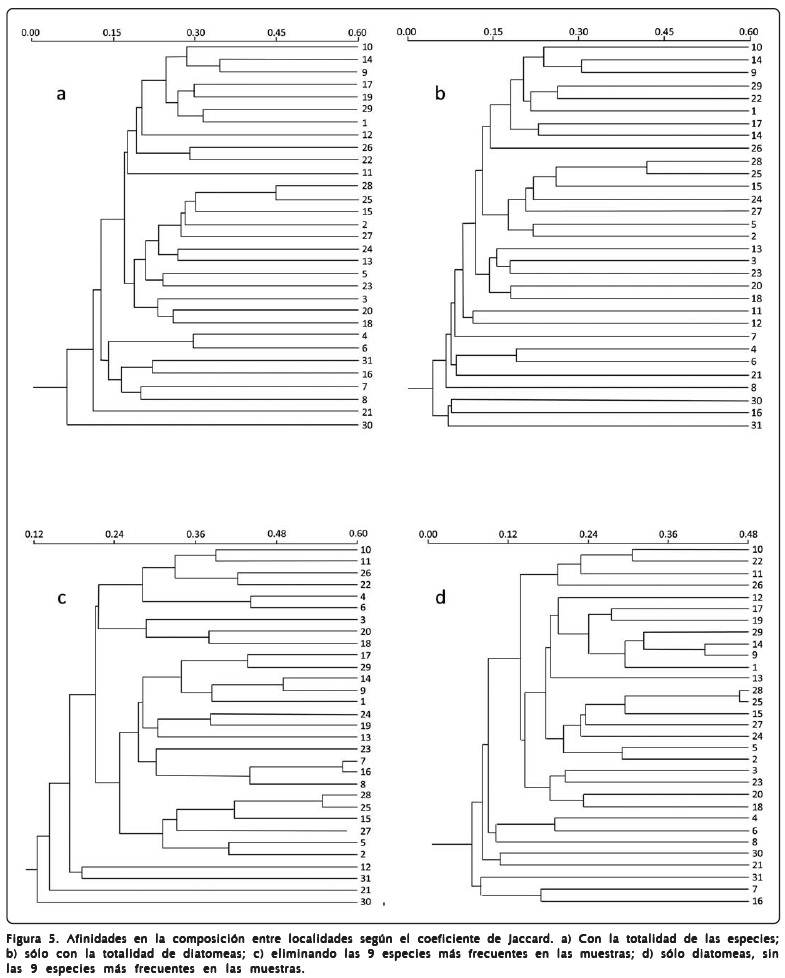 Al comparar las similitudes de la composición específica entre las localidades, tanto con el total de las especies como sólo con las diatomeas (Figura 5a, b), se obtuvieron agrupaciones poco relevantes. Al descartar de la matriz original las 9 especies más ampliamente distribuidas tampoco se obtuvieron agrupaciones definidas (Figura 5c, d).