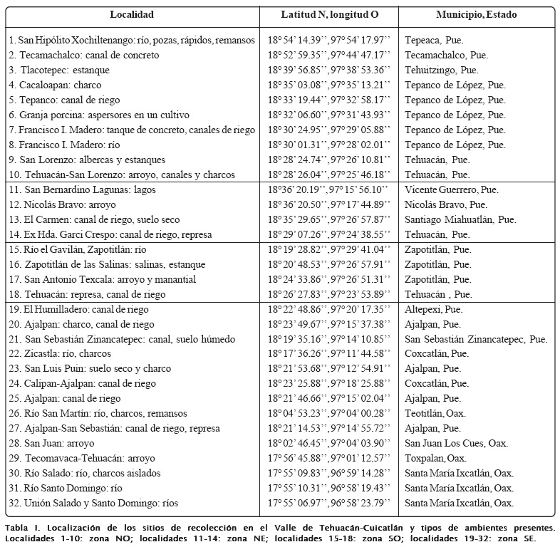 Los sitios de recolección fueron los cuerpos de agua del centro del Valle y aquéllos que se señalan como permanentes en las cartografías accesibles. Los sitios se muestran en la Figura 1 y sus nombres, tipos de ambientes y localizaciones en la Tabla I.