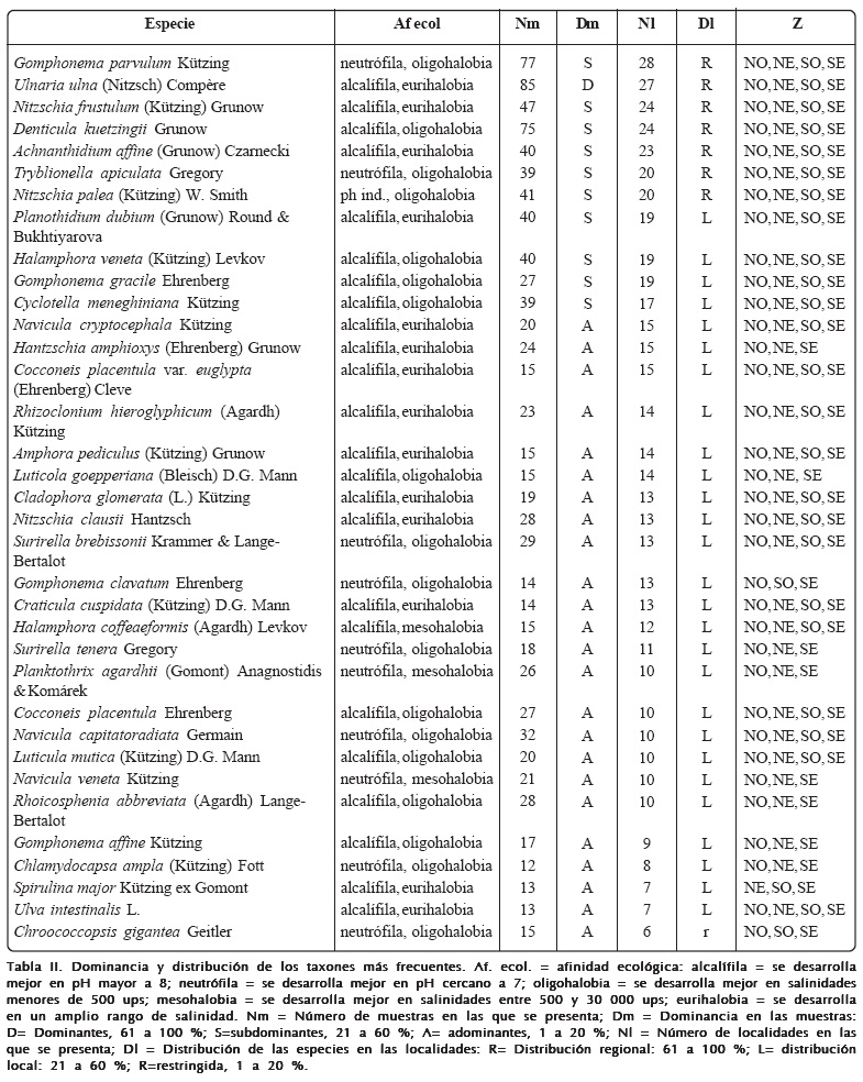 De las 35 especies más frecuentes en las muestras 26 son alcalífilas, 9 neutrófilas , 18 oligohalobias, 14 eurihalobias y 3 mesohalobias (Tabla II). Estos datos podrían sugerir que las condiciones generales del Valle son de aguas con pH de neutros a alcalinos y con salinidades moderadas, pero cambiantes. Si las especies más frecuentes nos ofrecen poca información o indicios de las condiciones generales o los gradientes en las que se desarrollan mejor, entonces ellas no nos permiten caracterizar de manera general, las condiciones más comunes del Valle: todas han sido registradas en condiciones contrastantes de pH, salinidad, estado trófico de agua, etc. Asimismo, las especies dominantes o subdominantes y de distribución regional o local tienen espectros ecológicos muy amplios y con distribución cosmopolita (Tabla II).