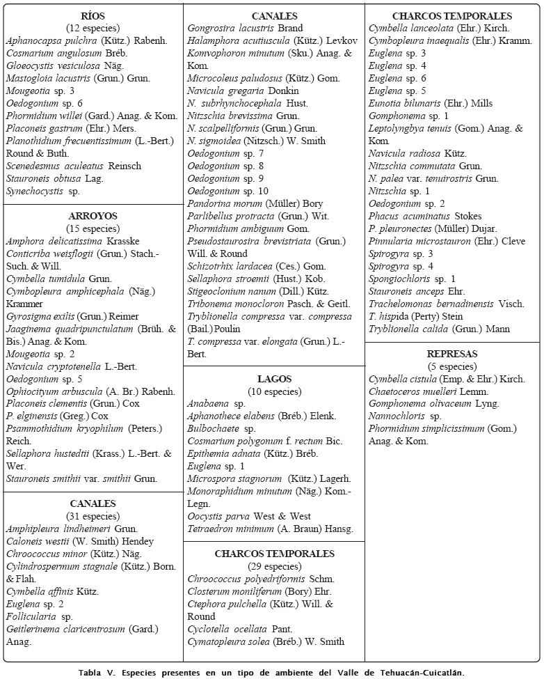 Las Bacillariophyta fueron principalmente metafíticas y perifíticas en todas las localidades asociadas a crecimientos de Cladophora spp., Rhizoclonium hierogliphicum, Ulva intestinalis e Hydrodictyon reticulatum. Sólo algunas diatomeas fueron especies epilíticas o planctónicas en el Valle. Las Cyanoprokaryota epilíticas fueron poco evidentes o raras comparadas con las de otras regiones de México30 y fueron principalmente organismos filamentosos subaereofíticos, esos filamentos crecen como películas en ambientes estacionales. Las Chlorophyta fueron planctónicas, subaerofíticas o edáficas y principalmente de formas coccoides, pero los filamentos de ese grupo forman matas muy abundantes cubriendo grandes extensiones en lugares con aguas corrientes. Un ejemplo de afinidades se muestra en la Tabla V con las especies que se presentaron solamente en un ambiente. En general, la mayoría de las especies son euriahalobias y afines a condiciones alcalinas.
