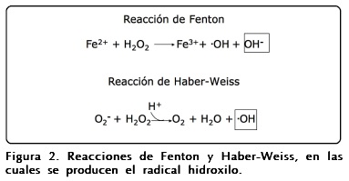 En la molécula de oxígeno, los electrones no apareados poseen giros paralelos, de tal manera que para que el O2 oxide otro átomo o molécula, éste tendría que aceptar un par de electrones con giro contrario o aceptar un solo electrón a la vez (limitación del giro o "spin"). Si un solo electrón se adiciona al O2, éste se localizará en uno de los orbitales π* de antiunión y el producto será el radical superóxido (O2* -). De la adición de un electrón más, resultará el ión peróxido, el cual se protona rápidamente en el ambiente celular para producir el peróxido de hidrógeno (H2O2)3. El H2O2, producto de la dismutación del superóxido, puede cruzar las membranas biológicas y auque es relativamente poco reactivo, a partir de éste y en presencia de metales de transición reducidos, la reducción parcial del peróxido genera el radical hidroxilo (• OH), uno de los oxidantes más fuertes de la naturaleza4. Cuando el metal involucrado es el Fe2+, la reacción es conocida como reacción de Fenton5 (Fig. 2). En los sistemas vivos la reacción que genera radicales hidroxilos además de la reacción de Fenton, es conocida como la reacción de Haber-Weiss6 (Fig. 2), en la cual en presencia de superóxido y peróxido de hidrógeno se generan más radicales hidroxilo7.