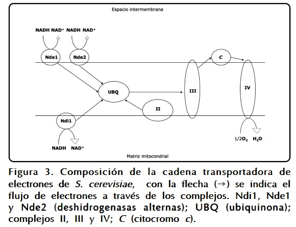 Las levaduras presentan diferentes complejos enzimáticos encargados de las reacciones de transporte de electrones (Fig. 3), aunque no todos ellos son similares a los de bovino o humano.