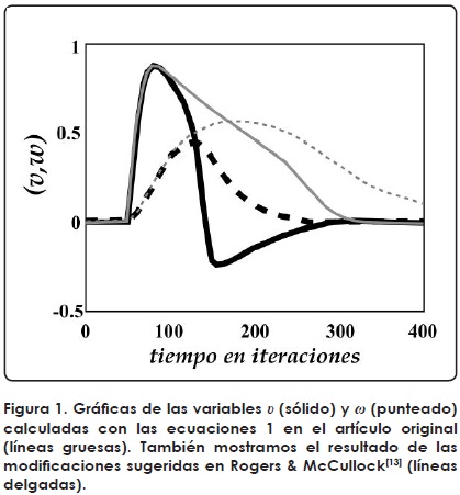 donde a, b, c1, c2 y c3 son parámetros ajustables. El valor de estos parámetros da un potencial de acción normalizado. La corriente aplicada iapp también se escala para que coincida con este modelo normalizado. Imágenes de υ y ω se muestran en la Figura 1. El potencial de acción mostrado en la figura resulta de aplicar una corriente iapp con resistencia de 0.05 Ohms, y una duracion de t = 50 s hasta t = 60 s.