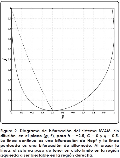 La región de parámetros de interés es el área entre la curva punteada y la continua de la Fig. 2. La región presenta oscilaciones regulares de alta frecuencia (taquicardia) causadas por la existencia de un ciclo límite que encierra a los puntos fijos, los cuales son inestables. En la frontera azul, los puntos fijos se vuelven estables y la cuenca de atracción crece al cruzar la curva, donde se tiene un sistema biestable con frentes de ondas viajeras. Por ejemplo, un punto de la frontera es (gc, fc) = (0.165, 0.5043), para C = 0, h = -2.5 y η= 0.5.