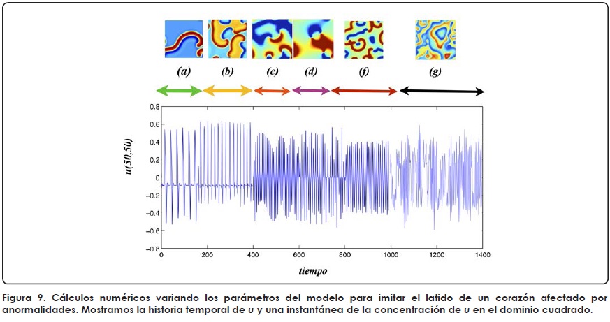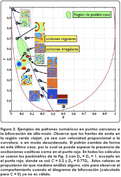 Los recuadros muestran la concentración de υ en un código de color en donde el rojo indica concentración alta y azul baja. Esto puede asociarse al estado de polarización de las células en una región. Observe que para valores grandes de f aparecen ondas espirales, que se mueven lentamente, pero cambian de color rápidamente en el tiempo, lo cual resulta en un espectro con dos frecuencias distintas. A la izquierda de la línea azul se obtienen ondas espirales del tipo Belousov-Zhabotinsky[21] con diversas frecuencias. Al aproximarse a la bifurcación de Hopf, se observa que aparecen gotas y "ojos", cuya descripción y análisis está fuera del propósito de este artículo. Si en esta región se cambia la razón entre los coeficientes de difusión, entonces los patrones dejan de oscilar y se obtiene un patrón espacial fijo, del tipo Turing.