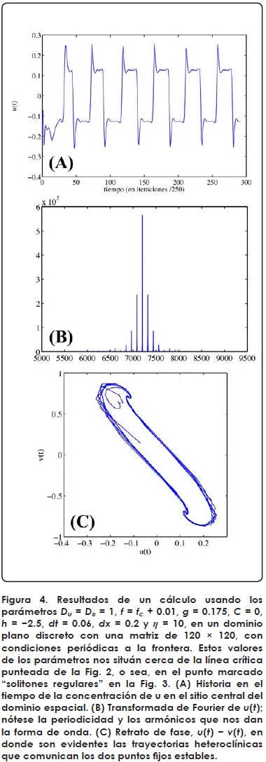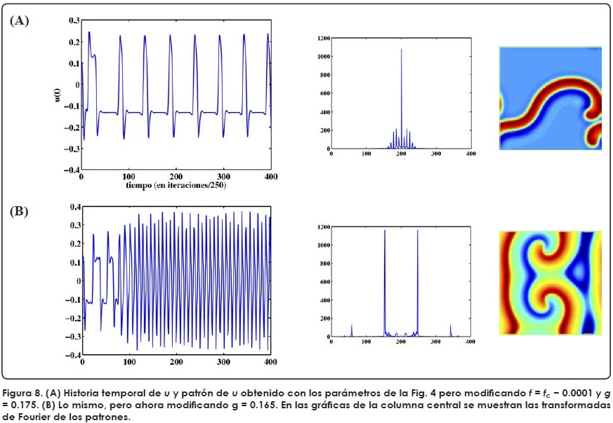 Nuestro modelo es capaz de reproducir historias temporales de excitación similares a las formas de onda registradas en un ECG, si variamos los parámetros adecuadamente. En la Fig. 8(A) mostramos un cálculo que presenta "wavelets", en los que los frentes de u máxima son angostos, la forma de onda es muy similar a la mostrada en la Fig. 7. También mostramos el espectro de Fourier de las oscilaciones.