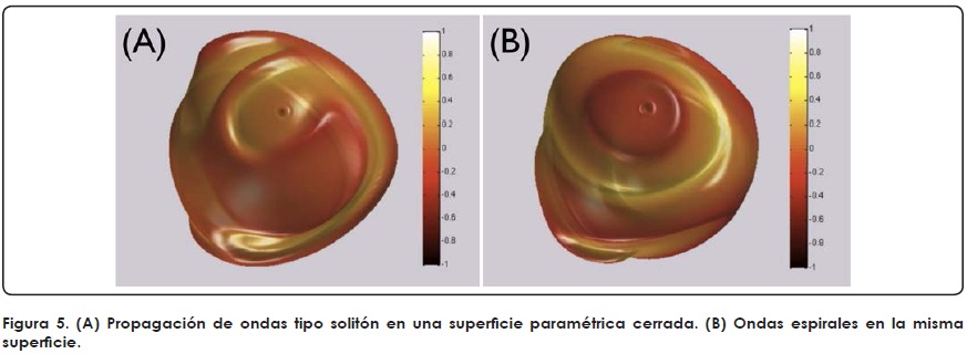 No es evidente que los patrones obtenidos en un dominio bidimensional plano con condiciones periódicas se obtengan en otras geometrías. Para aplicar nuestro modelo al funcionamiento de un corazón real, al menos es necesario hacer los cálculos en una superficie cerrada convexa. En la Fig. 5 mostramos que las ondas viajeras se presentan en una superficie paramétrica simple que se asemeja a la forma de una cavidad cardiaca. En esta figura hemos asociado una contracción del radio de curvatura local de la superficie proporcional al valor de u(x, y) y la barra de colores señala en amarillo las regiones de contracción. Ésta es una representación burda de la actividad muscular del corazón debida a la actividad eléctrica modelada.