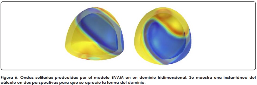 En la Fig. 6 se muestra una instantánea de la concentración de υ en un dominio acotado por dos semi-elipses de diferente excentricidad y una cubierta inferior esférica, en un cálculo con los mismos parámetros de la Fig 4. Esto simula la forma de una cavidad cardiaca. La escala de colores es igual que en las demás figuras. Debido a la transparencia de la figura, observamos que el patrón de ondas solitarias sigue un comportamiento igual que en el dominio plano y se transmite en la tercera dimensión, lo cual significa que todos los puntos del interior presentan la misma concentración de υ que en las superficies que los acotan. En un corazón sano se presentandos nodos principales, por lo que, para obtener dos nodos fijos, en este cálculo se fijó el valor de u = 0 en los extremos superior e inferior del dominio, lo cual tiene el efecto de fijar el punto de rotación de los solitones, simulando así la excitación externa del corazón.