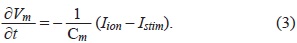 El modelo H-H fue desarrollado para una célula aislada; en estas condiciones, ninguna corriente puede fluir hacia el medio intracelular, por tanto Im= 0, y la evolución del potencial de membrana puede escribirse, a partir de la Ecuación 2 como: