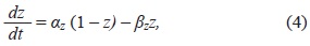 donde la variable αz es el intervalo de tiempo en el que el canal iónico está abierto y βz el intervalo de tiempo en el que está cerrado. Éstas se obtienen empíricamente y tienen una dependencia no lineal de funciones exponenciales de Vm. Las Ecuaciones 2, 3 y 4 son, por lo tanto, un sistema de ecuaciones diferenciales acopladas, cuya solución, bajo condiciones de estado estacionario, se caracteriza por sus valores asintóticos z∞ y su constante de tiempo τz.