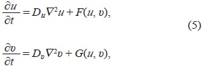 donde υ y ν son los morfógenos con coeficientes de difusión Dυ y Dν, respectivamente. F y G son funciones que describen la cinética química y son, en general, no lineales y no existe un criterio general para establecerlas, sus expresiones dependen del problema químico o biológico bajo estudio.