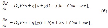 donde η es un parámetro que impone la escala espacio temporal del sistema. Las tasas de crecimiento de υ y ν están descritas en términos de los parámetros f, g y h, que son convenientes para explorar la región de parámetros de interés en este trabajo. La razón entre las intensidades de los términos cuadráticos y cúbicos está dada por C.