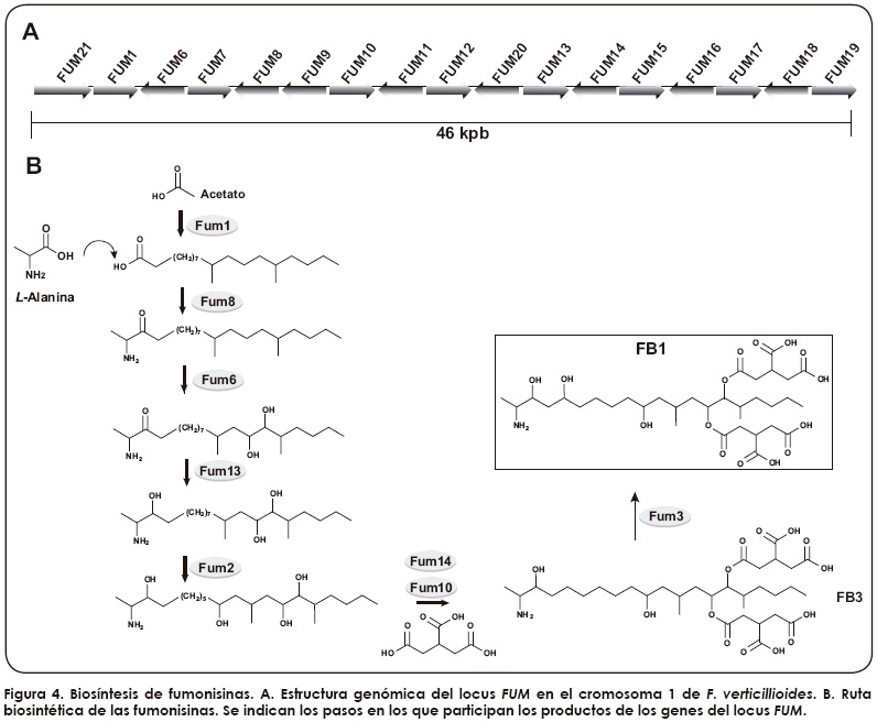 Debido a que las fumonisinas se consideran metabolitos secundarios, en un principio se asumió que la FB1 se producía durante la fase tardía de la interacción Fusarium-maíz, es decir, en la etapa saprofítica del hongo. Sin embargo, evidencias recientes muestran que la expresión de los genes FUM y la síntesis de fumonisina ocurren en los periodos tempranos de la infección in planta73-75 e, incluso, durante la fase endofítica en la plántula de maíz8.