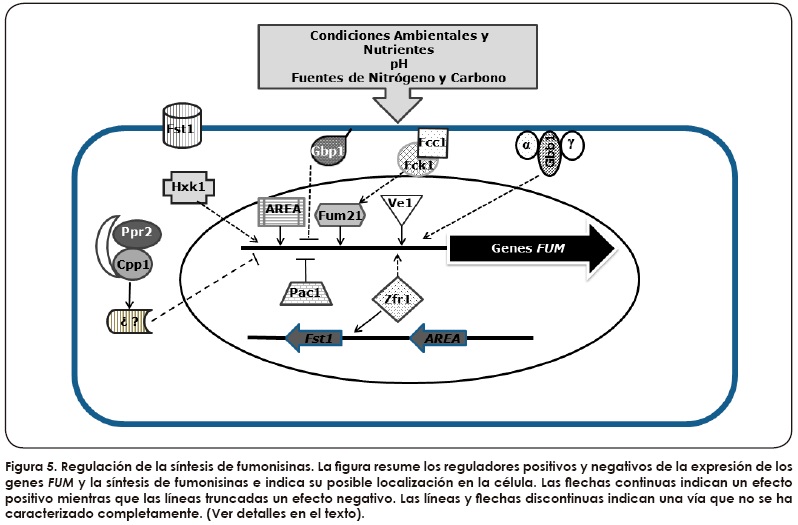 Como lo ilustra la Tabla I, la producción de fumonisinas por distintas cepas de F. verticillioides es muy variable y los rangos pueden abarcar hasta tres órdenes de magnitud, aún cuando las cepas crezcan bajo las mismas condiciones en un sustrato natural como maíz o en un medio de cultivo de composición definida. Factores ambientales por ejemplo, pH, disponibilidad de agua y nutrientes también regulan la síntesis de fumonisinas. Asimismo, hay genes fuera del locus FUM que participan, a distintos niveles, en las vías de señalización que conducen a la expresión de los genes del locus FUM y a la generación de fumonisinas55,56 (Figura 5).