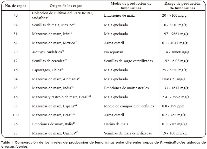 En 1988, un grupo de investigadores sudafricanos aislaron y purificaron las fumonisinas de cultivos de F. verticillioides cuando buscaban el agente causal de la leucoencefalomalacia equina, que se asociaba con el consumo de maíz mohoso23. Ese mismo año se dilucidó la estructura química de las toxinas24 y, desde entonces, se han descrito más de 60 moléculas relacionadas estructuralmente con la fumonisina25,26. Sin embargo, sólo ciertas cepas del hongo producen muchas de esas moléculas y en condiciones particulares de cultivo. Las fumonisinas más abundantes de incidencia natural son las del grupo B, derivadas de la mayoría de las cepas de F. verticillioides. Las fumonisinas B contienen un esqueleto lineal de 20 carbones, con un amino en el C-2 y residuos de ácido tricarboxílico esterificados en C-14 y C-15 (Figura 3). Estos compuestos difieren por la presencia o la ausencia de un grupo hidroxilo en los C-5 y C-10. Dentro de esta familia predominan las fumonisinas B1, B2 y B3, pero la B1 (FB1) conforma más del 75% del total de las fumonisinas; asimismo, es la más estudiada27,28. Los niveles de producción de la toxina FB1 son muy variables entre las cepas de F. verticillioides, ya que algunas de ellas no la sintetizan, o bien, lo hacen a niveles muy bajos; en cambio, otras generan grandes cantidades de la toxina. La Tabla I ilustra esa diversidad, pues recopila varios estudios con cepas aisladas en distintas regiones geográficas, las que presentan variaciones de hasta tres órdenes de magnitud en los niveles de FB1.