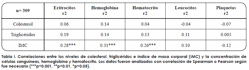 En el presente estudio se tuvo una muestra de 309 mujeres con un rango de edad de 19 a 89 años. La concentración de eritrocitos y hemoglobina, así como el hematocrito mostraron una correlación positiva débil pero significativa con el IMC (Tabla I).