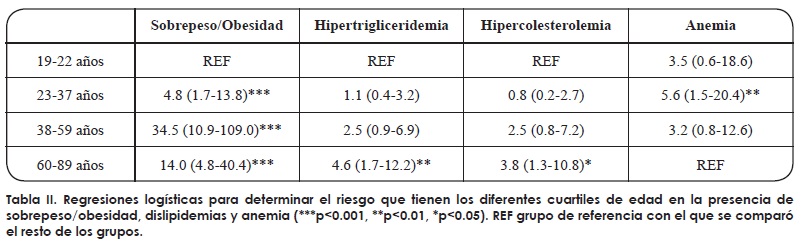 Se analizó el impacto de la edad en patologías metabólicas mediante regresiones logísticas, mostrando al grupo de mujeres de 38 a 59 años con mayor riesgo para el sobrepeso/obesidad que las mujeres de los otros grupos de edad (Tabla II). Las del último cuartil de edad (60-89 años) tuvieron mayor riesgo para presentar hipercolesterolemia e hipertrigliceridemia en comparación con el grupo más joven (Tabla II).