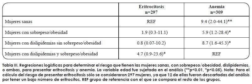 Para determinar si la presencia de obesidad con o sin dislipidemias tiene alguna relación con eritrocitosis y anemia (las alteraciones sanguíneas más frecuentes) se realizaron regresiones logísticas, controlando a la variable edad. Las mujeres con sobrepeso/obesidad y dislipidemias tuvieron mayor riesgo para presentar una mayor concentración de eritrocitos. Por su parte, los grupos de mujeres sanas (sin sobrepeso/obesidad o dislipidemias) tuvieron mayor riesgo para presentar anemia en comparación con las mujeres con IMC alto y dislipidemias (Tabla III).