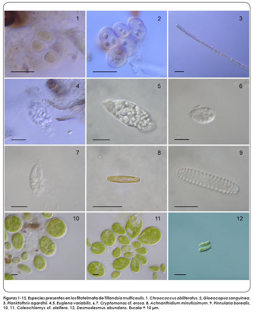 Los taxones identificados fueron 16 en las fitotelmata de Tillandsia multicaulis, 12 provenientes de las preparaciones permanentes y 4 de los cultivos. Pertenecen a las Divisiones Cyanoprokariota (tres especies), Euglenophyta (una especie), Cryptophyta (una especie), Bacillariophyta (dos especies) y Chlorophyta (nueve especies) (Tabla I).